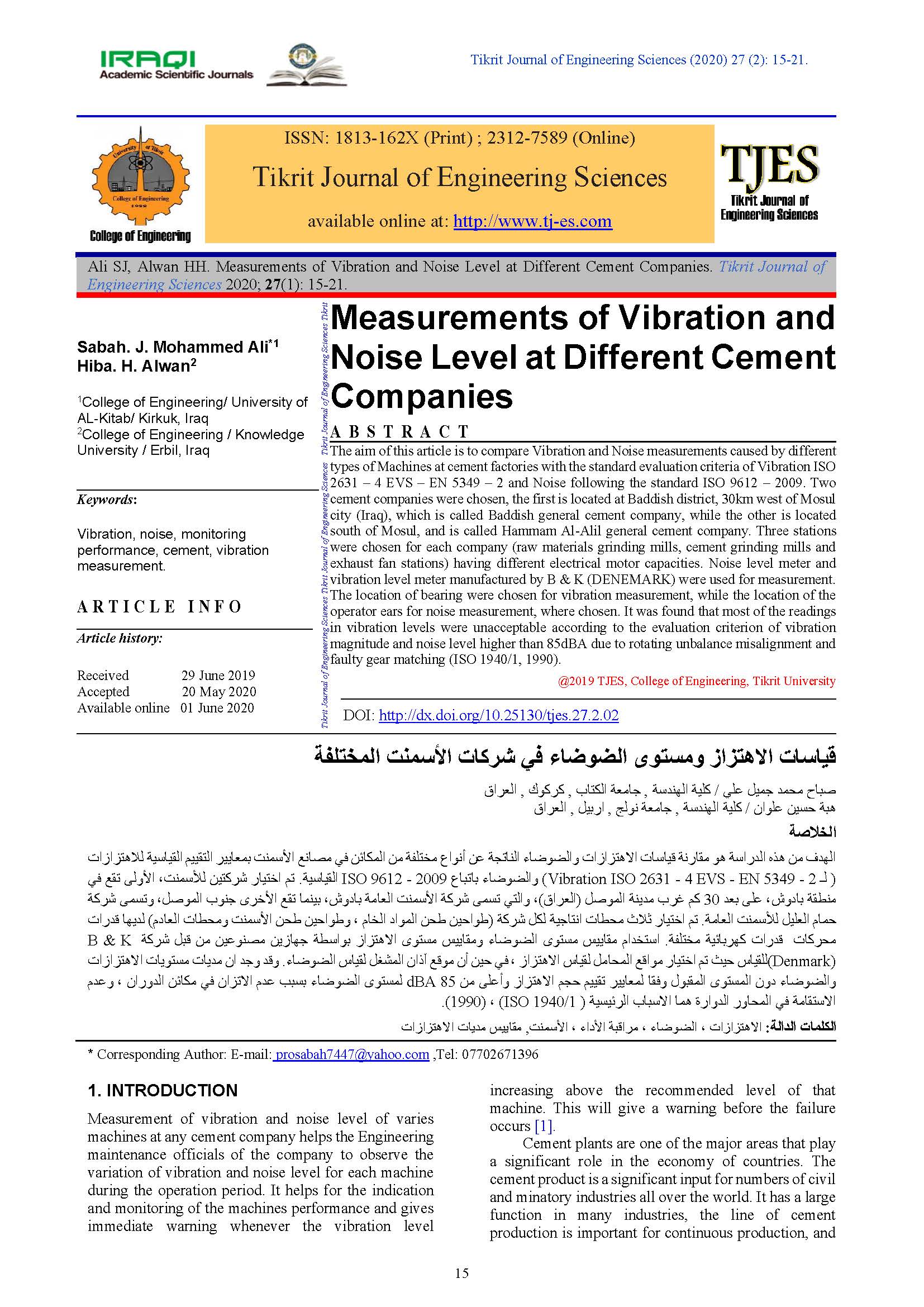 The aim of this article is to compare Vibration and Noise measurements caused by different types of Machines at cement factories with the standard evaluation criteria of Vibration ISO 2631 – 4 EVS – EN 5349 – 2 and Noise following the standard ISO 9612 – 2009. Two cement companies were chosen, the first is located at Baddish district, 30km west of Mosul city (Iraq), which is called Baddish general cement company, while the other is located south of Mosul, and is called Hammam Al-Alil general cement company. Three stations were chosen for each company (raw materials grinding mills, cement grinding mills and exhaust fan stations) having different electrical motor capacities. Noise level meter and vibration level meter manufactured by B & K (DENEMARK) were used for measurement. The location of bearing were chosen for vibration measurement, while the location of the operator ears for noise measurement, where chosen. It was found that most of the readings in vibration levels were unacceptable according to the evaluation criterion of vibration magnitude and noise level higher than 85dBA due to rotating unbalance misalignment and faulty gear matching (ISO 1940/1, 1990).