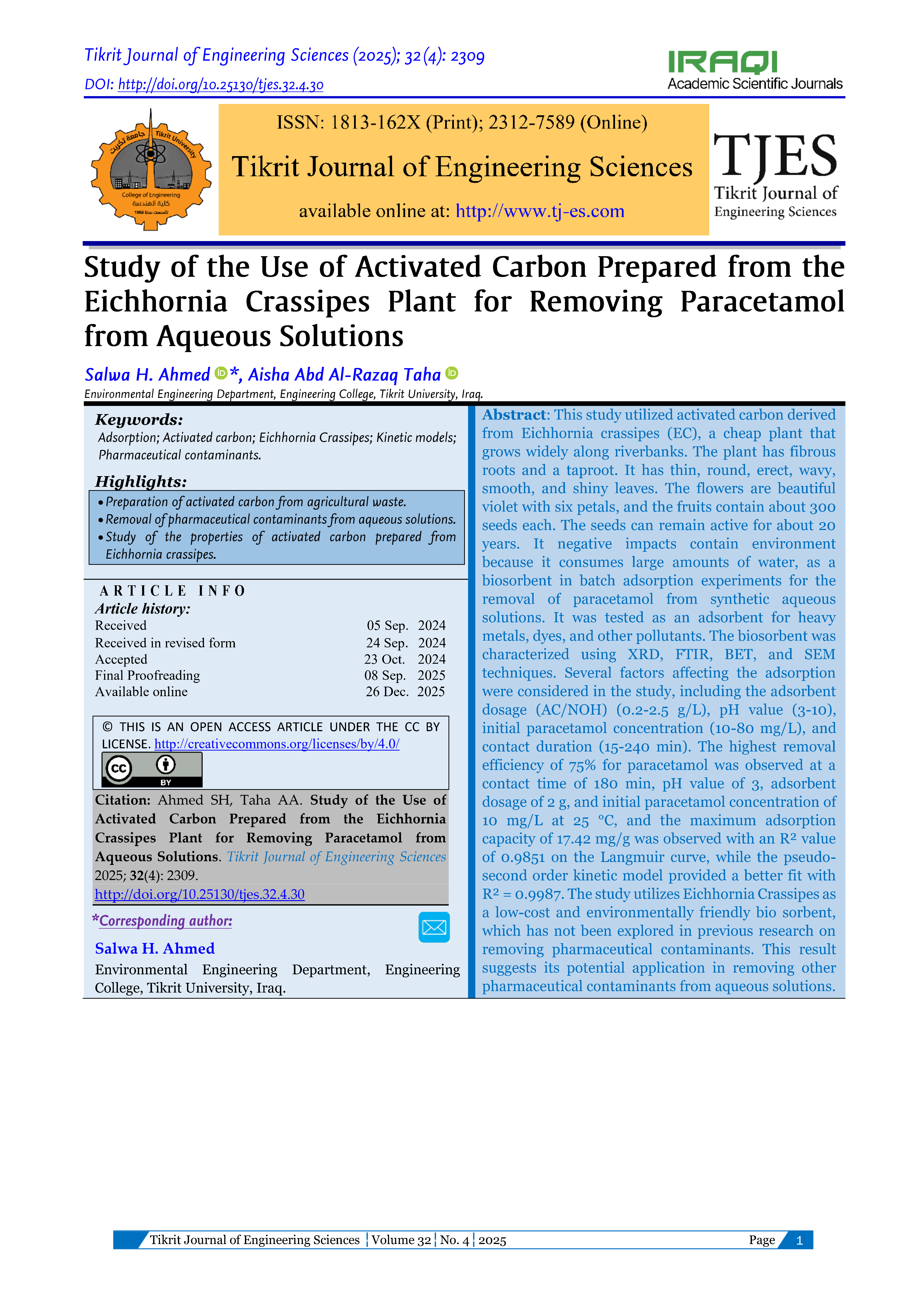 This study utilized activated carbon derived from Eichhornia crassipes (EC), a cheap plant that grows widely along riverbanks. The plant has fibrous roots and a taproot. It has thin, round, erect, wavy, smooth, and shiny leaves. The flowers are beautiful violet with six petals, and the fruits contain about 300 seeds each. The seeds can remain active for about 20 years. It negative impacts contain environment because it consumes large amounts of water, as a biosorbent in batch adsorption experiments for the removal of paracetamol from synthetic aqueous solutions. It was tested as an adsorbent for heavy metals, dyes, and other pollutants. The biosorbent was characterized using XRD, FTIR, BET, and SEM techniques. Several factors affecting the adsorption were considered in the study, including the adsorbent dosage (AC/NOH) (0.2-2.5 g/L), pH value (3-10), initial paracetamol concentration (10-80 mg/L), and contact duration (15-240 min). The highest removal efficiency of 75% for paracetamol was observed at a contact time of 180 min, pH value of 3, adsorbent dosage of 2 g, and initial paracetamol concentration of 10 mg/L at 25 °C, and the maximum adsorption capacity of 17.42 mg/g was observed with an R² value of 0.9851 on the Langmuir curve, while the pseudo-second order kinetic model provided a better fit with R² = 0.9987. The study utilizes Eichhornia Crassipes as a low-cost and environmentally friendly bio sorbent, which has not been explored in previous research on removing pharmaceutical contaminants. This result suggests its potential application in removing other pharmaceutical contaminants from aqueous solutions.