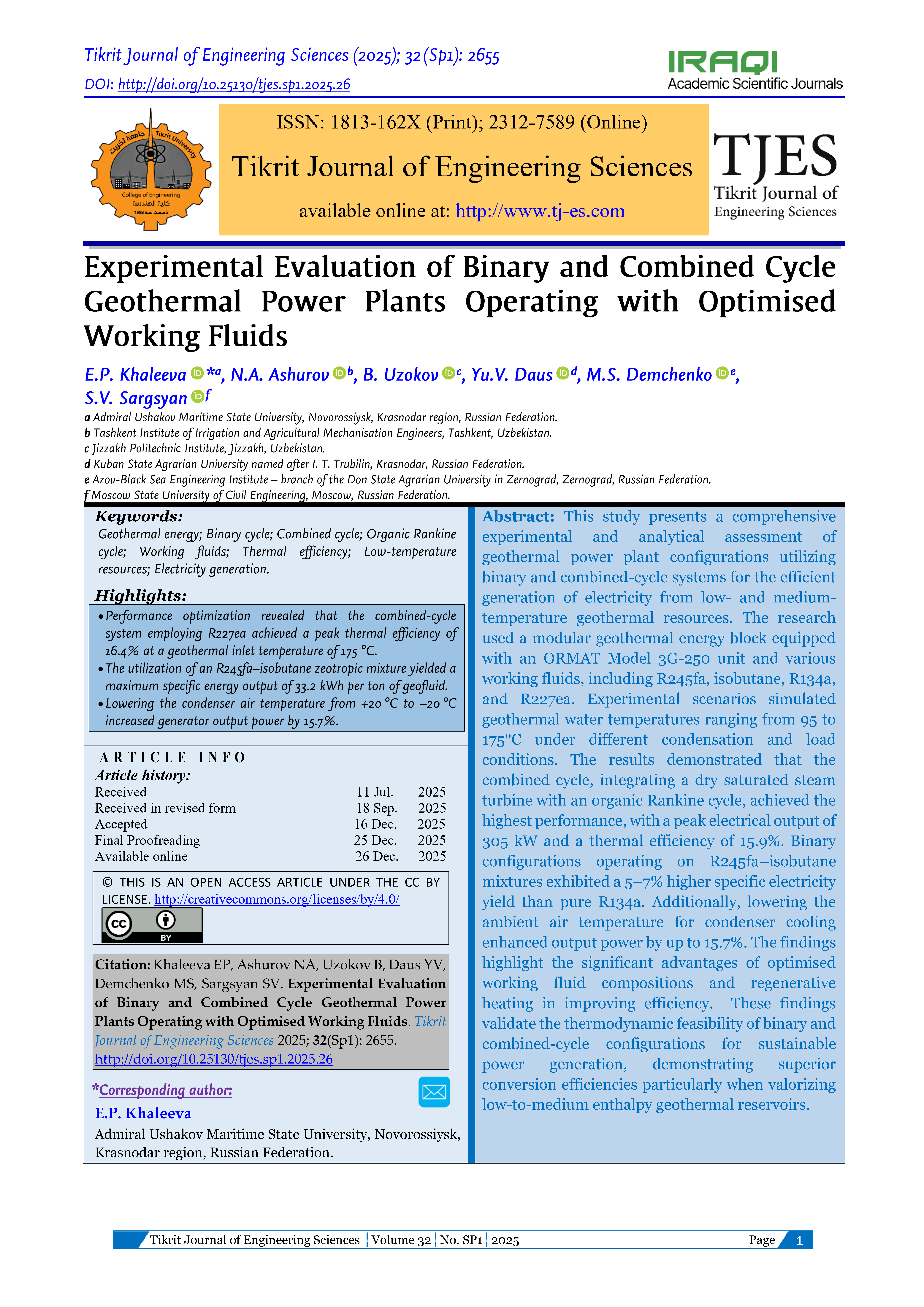 This study presents a comprehensive experimental and analytical assessment of geothermal power plant configurations utilizing binary and combined-cycle systems for the efficient generation of electricity from low- and medium-temperature geothermal resources. The research used a modular geothermal energy block equipped with an ORMAT Model 3G-250 unit and various working fluids, including R245fa, isobutane, R134a, and R227ea. Experimental scenarios simulated geothermal water temperatures ranging from 95 to 175°C under different condensation and load conditions. The results demonstrated that the combined cycle, integrating a dry saturated steam turbine with an organic Rankine cycle, achieved the highest performance, with a peak electrical output of 305 kW and a thermal efficiency of 15.9%. Binary configurations operating on R245fa–isobutane mixtures exhibited a 5–7% higher specific electricity yield than pure R134a. Additionally, lowering the ambient air temperature for condenser cooling enhanced output power by up to 15.7%. The findings highlight the significant advantages of optimised working fluid compositions and regenerative heating in improving efficiency. These findings validate the thermodynamic feasibility of binary and combined-cycle configurations for sustainable power generation, demonstrating superior conversion efficiencies particularly when valorizing low-to-medium enthalpy geothermal reservoirs.