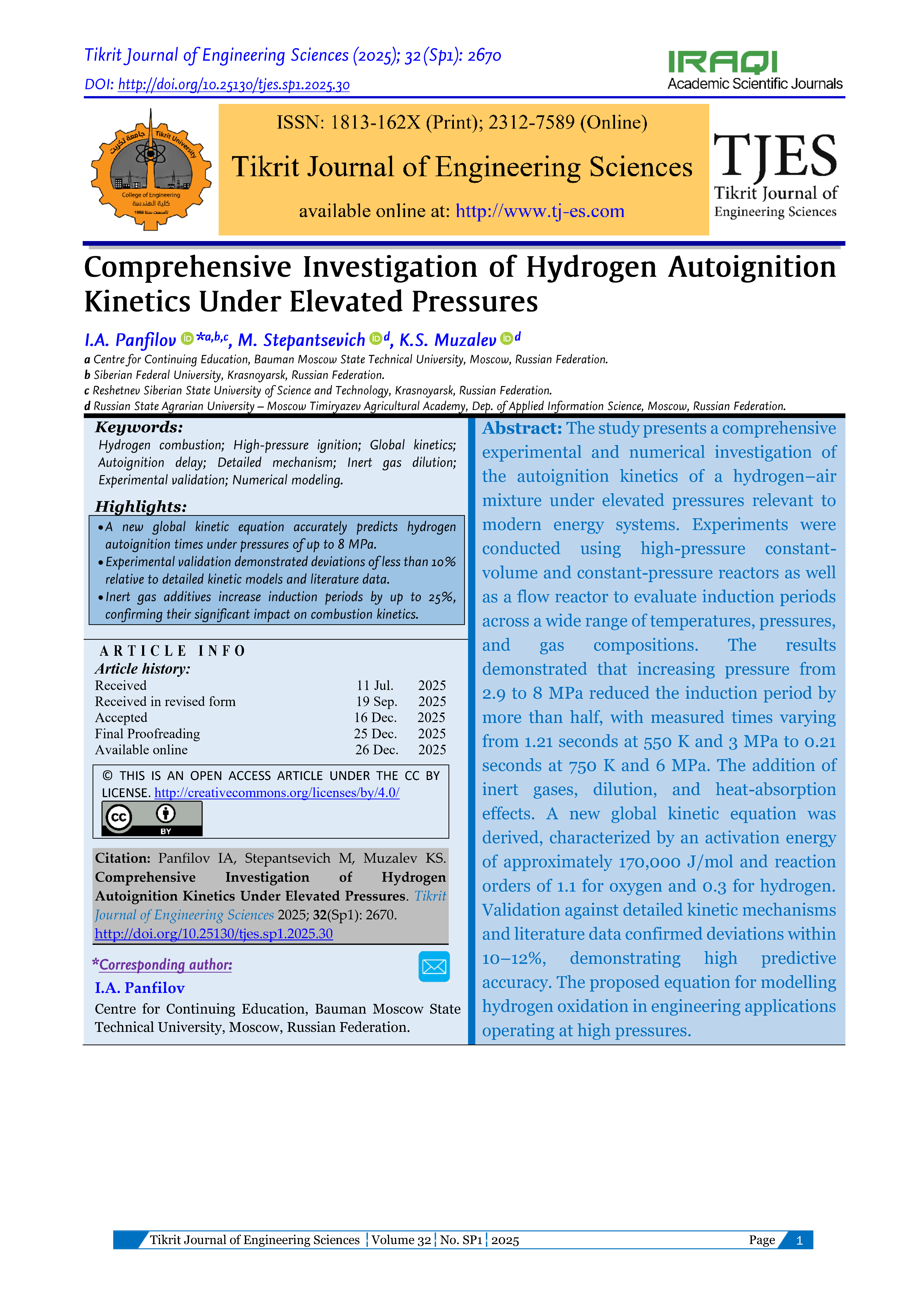 The study presents a comprehensive experimental and numerical investigation of the autoignition kinetics of a hydrogen–air mixture under elevated pressures relevant to modern energy systems. Experiments were conducted using high-pressure constant-volume and constant-pressure reactors as well as a flow reactor to evaluate induction periods across a wide range of temperatures, pressures, and gas compositions. The results demonstrated that increasing pressure from 2.9 to 8 MPa reduced the induction period by more than half, with measured times varying from 1.21 seconds at 550 K and 3 MPa to 0.21 seconds at 750 K and 6 MPa. The addition of inert gases, dilution, and heat-absorption effects. A new global kinetic equation was derived, characterized by an activation energy of approximately 170,000 J/mol and reaction orders of 1.1 for oxygen and 0.3 for hydrogen. Validation against detailed kinetic mechanisms and literature data confirmed deviations within 10–12%, demonstrating high predictive accuracy. The proposed equation for modelling hydrogen oxidation in engineering applications operating at high pressures.