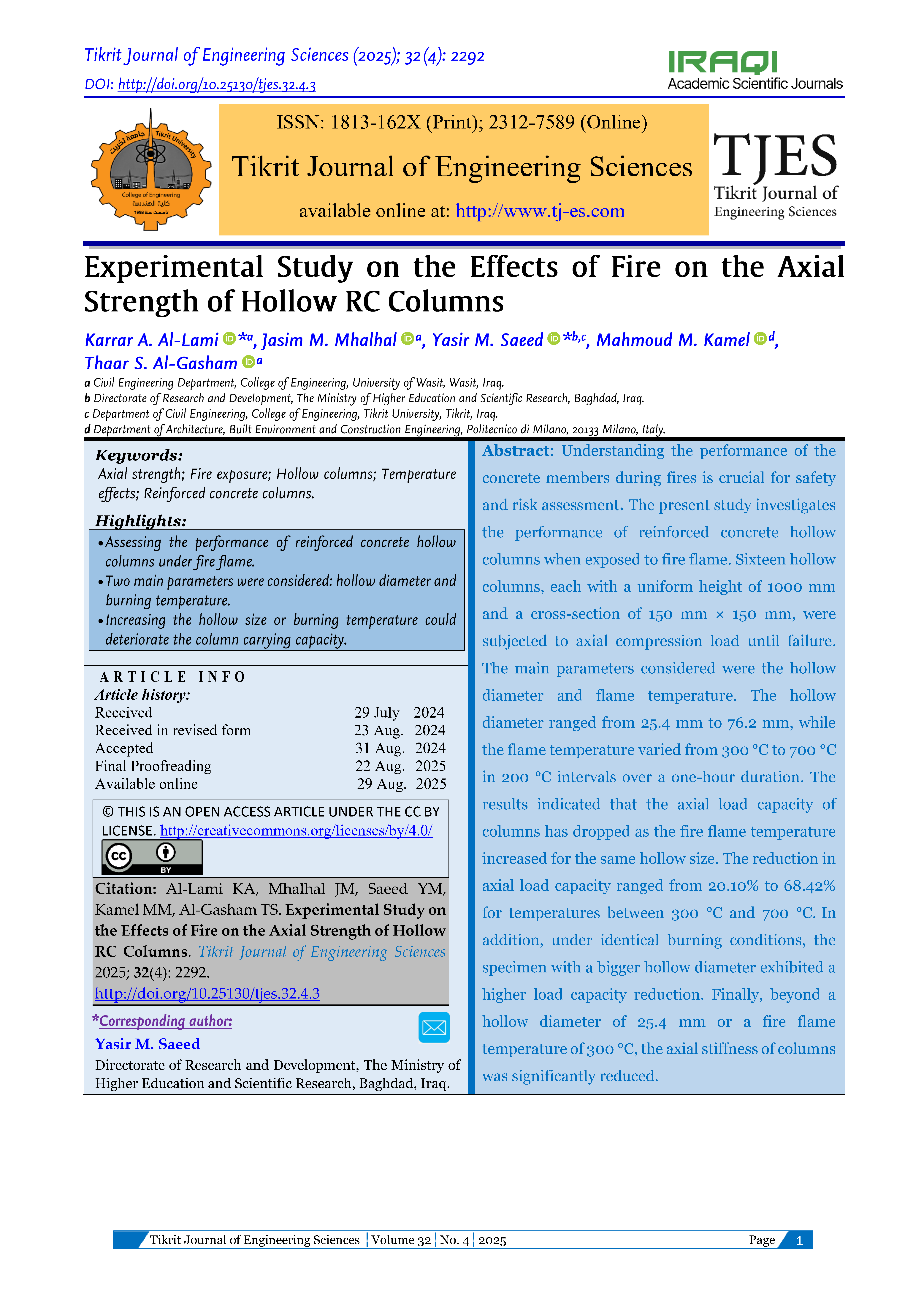 Klak FS, Jomaa’h M, Ahmad S. Behavior of Reinforced Concrete Members Exposed to Fire: Review Article. Tikrit Journal of Engineering Sciences 2022; 29(4): 56–68.