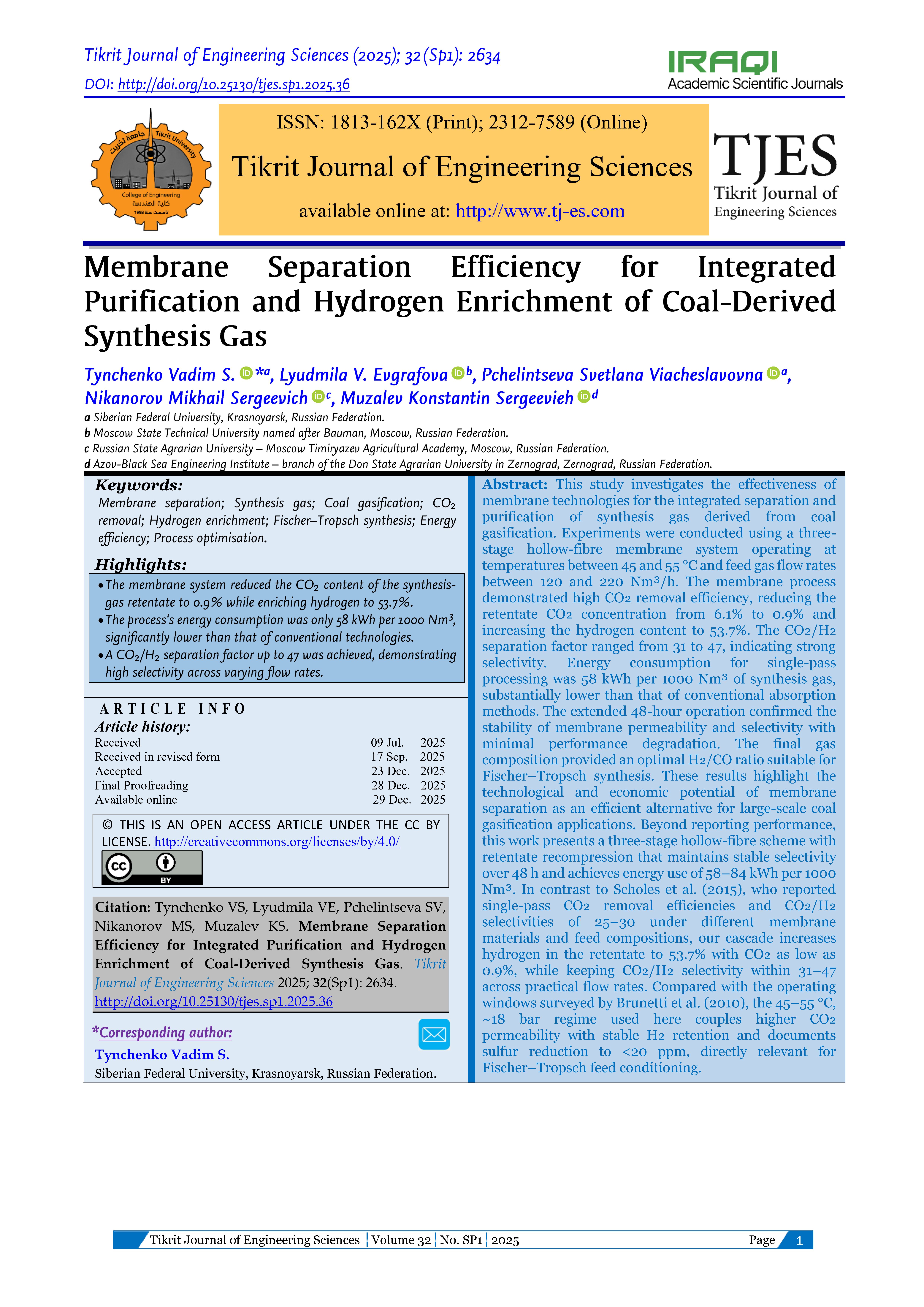This study investigates the effectiveness of membrane technologies for the integrated separation and purification of synthesis gas derived from coal gasification. Experiments were conducted using a three-stage hollow-fibre membrane system operating at temperatures between 45 and 55 °C and feed gas flow rates between 120 and 220 Nm³/h. The membrane process demonstrated high CO₂ removal efficiency, reducing the retentate CO₂ concentration from 6.1% to 0.9% and increasing the hydrogen content to 53.7%. The CO₂/H₂ separation factor ranged from 31 to 47, indicating strong selectivity. Energy consumption for single-pass processing was 58 kWh per 1000 Nm³ of synthesis gas, substantially lower than that of conventional absorption methods. The extended 48-hour operation confirmed the stability of membrane permeability and selectivity with minimal performance degradation. The final gas composition provided an optimal H₂/CO ratio suitable for Fischer–Tropsch synthesis. These results highlight the technological and economic potential of membrane separation as an efficient alternative for large-scale coal gasification applications. Beyond reporting performance, this work presents a three-stage hollow-fibre scheme with retentate recompression that maintains stable selectivity over 48 h and achieves energy use of 58–84 kWh per 1000 Nm³. In contrast to Scholes et al. (2015), who reported single-pass CO₂ removal efficiencies and CO₂/H₂ selectivities of 25–30 under different membrane materials and feed compositions, our cascade increases hydrogen in the retentate to 53.7% with CO₂ as low as 0.9%, while keeping CO₂/H₂ selectivity within 31–47 across practical flow rates. Compared with the operating windows surveyed by Brunetti et al. (2010), the 45–55 °C, ~18 bar regime used here couples higher CO₂ permeability with stable H₂ retention and documents sulfur reduction to <20 ppm, directly relevant for Fischer–Tropsch feed conditioning.