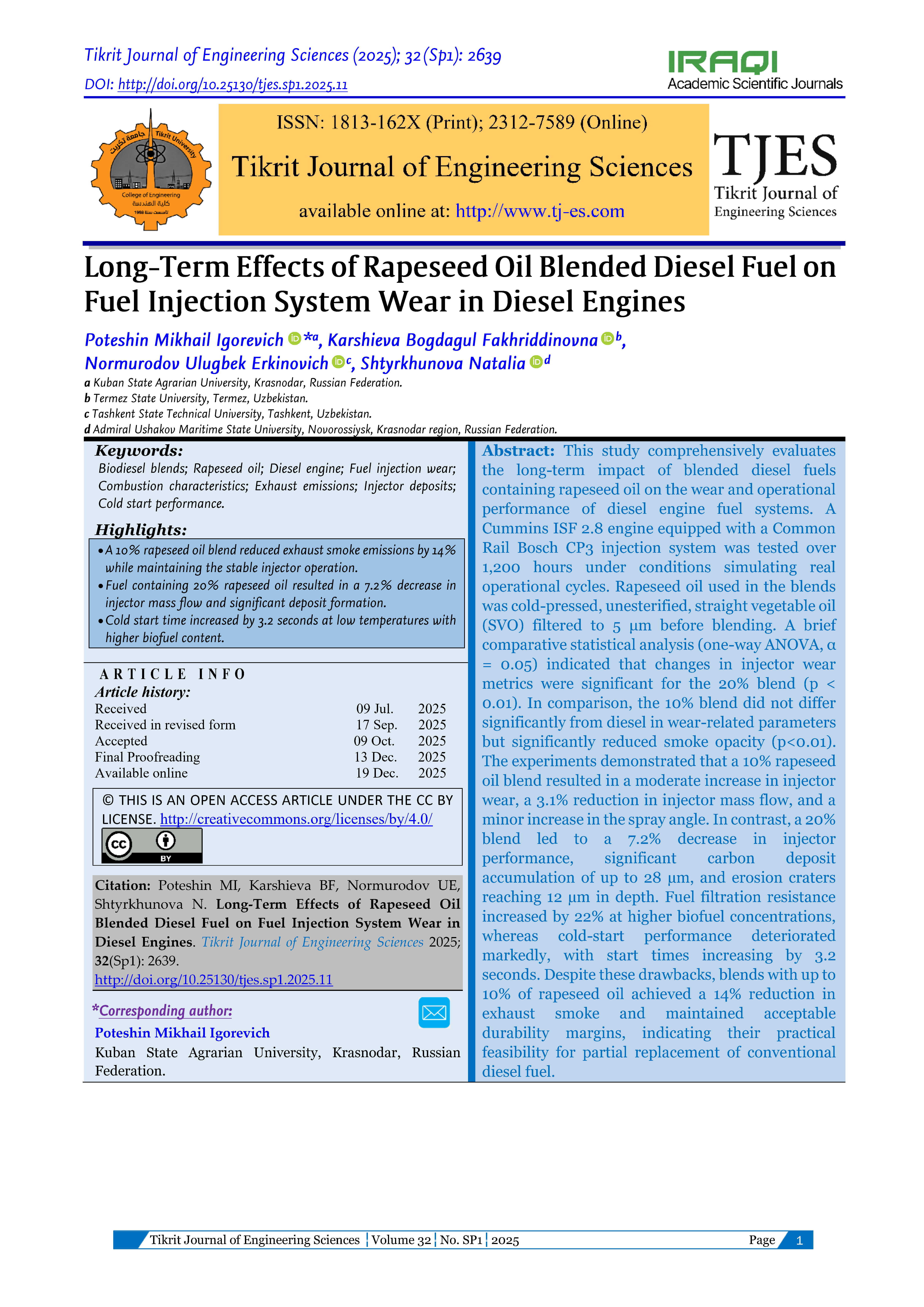 This study comprehensively evaluates the long-term impact of blended diesel fuels containing rapeseed oil on the wear and operational performance of diesel engine fuel systems. A Cummins ISF 2.8 engine equipped with a Common Rail Bosch CP3 injection system was tested over 1,200 hours under conditions simulating real operational cycles. Rapeseed oil used in the blends was cold-pressed, unesterified, straight vegetable oil (SVO) filtered to 5 μm before blending. A brief comparative statistical analysis (one-way ANOVA, α = 0.05) indicated that changes in injector wear metrics were significant for the 20% blend (p < 0.01). In comparison, the 10% blend did not differ significantly from diesel in wear-related parameters but significantly reduced smoke opacity (p<0.01). The experiments demonstrated that a 10% rapeseed oil blend resulted in a moderate increase in injector wear, a 3.1% reduction in injector mass flow, and a minor increase in the spray angle. In contrast, a 20% blend led to a 7.2% decrease in injector performance, significant carbon deposit accumulation of up to 28 µm, and erosion craters reaching 12 µm in depth. Fuel filtration resistance increased by 22% at higher biofuel concentrations, whereas cold-start performance deteriorated markedly, with start times increasing by 3.2 seconds. Despite these drawbacks, blends with up to 10% of rapeseed oil achieved a 14% reduction in exhaust smoke and maintained acceptable durability margins, indicating their practical feasibility for partial replacement of conventional diesel fuel.
