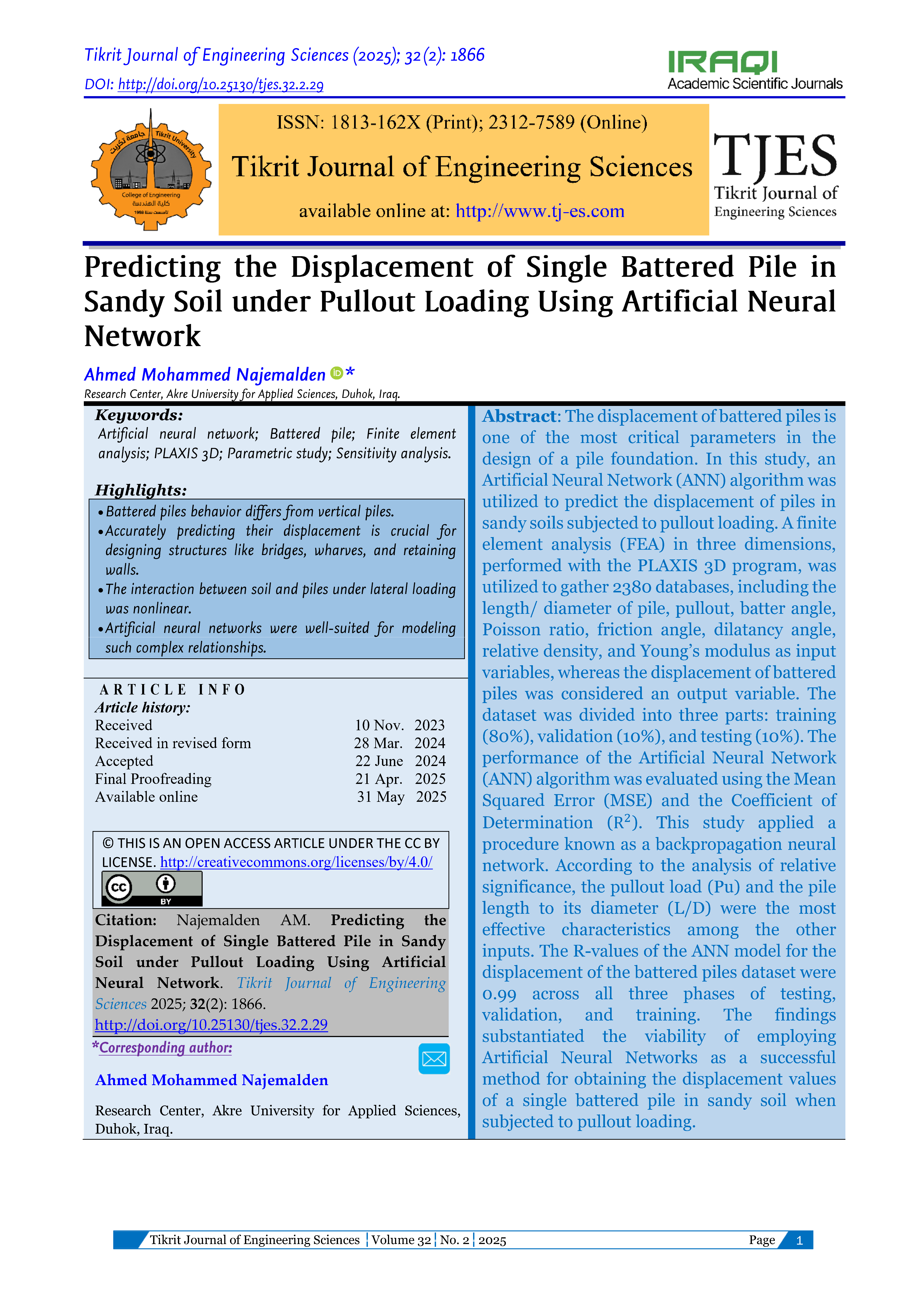 Predicting the Displacement of Single Battered Pile in Sandy Soil under Pullout Loading Using Artificial Neural Network