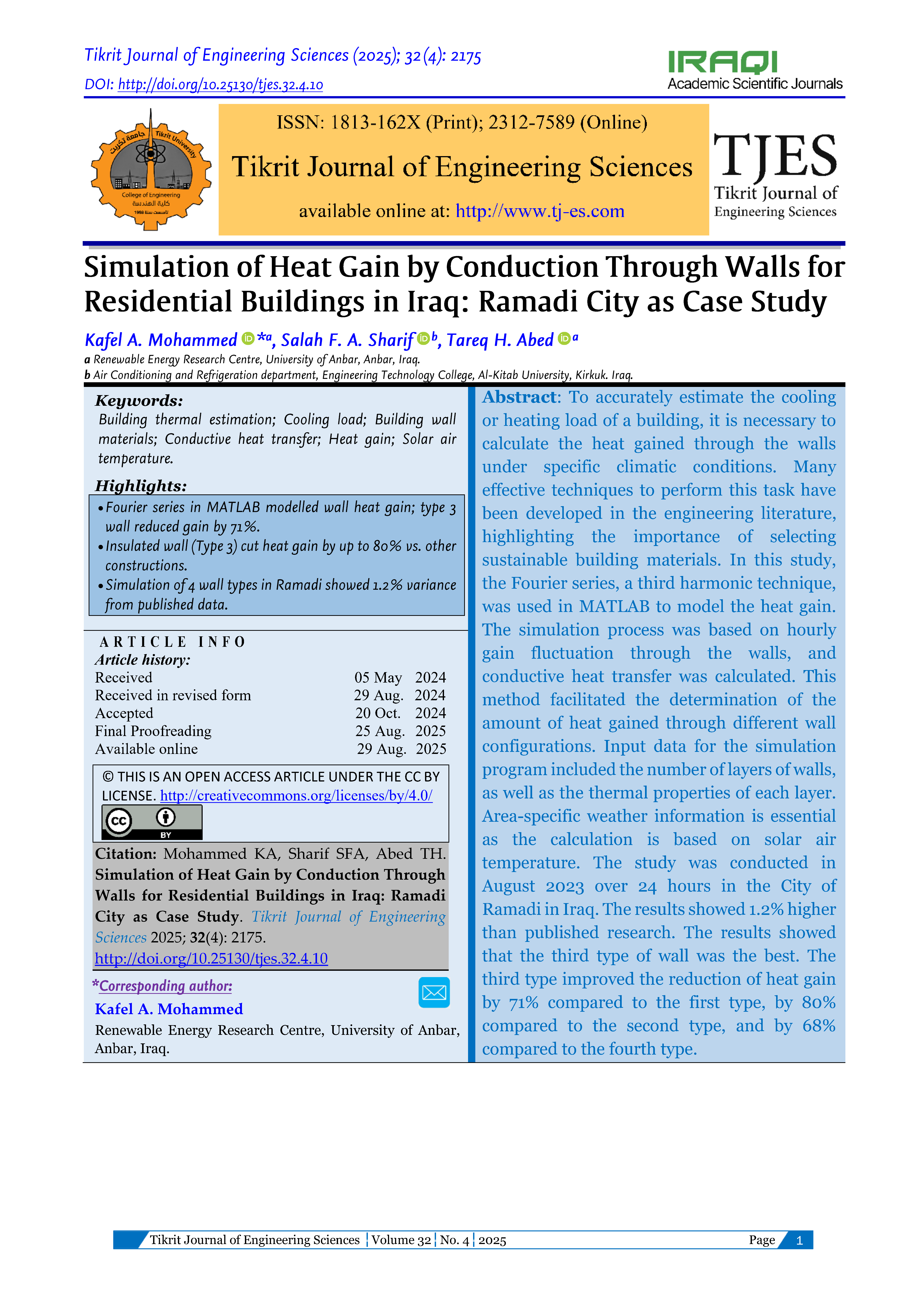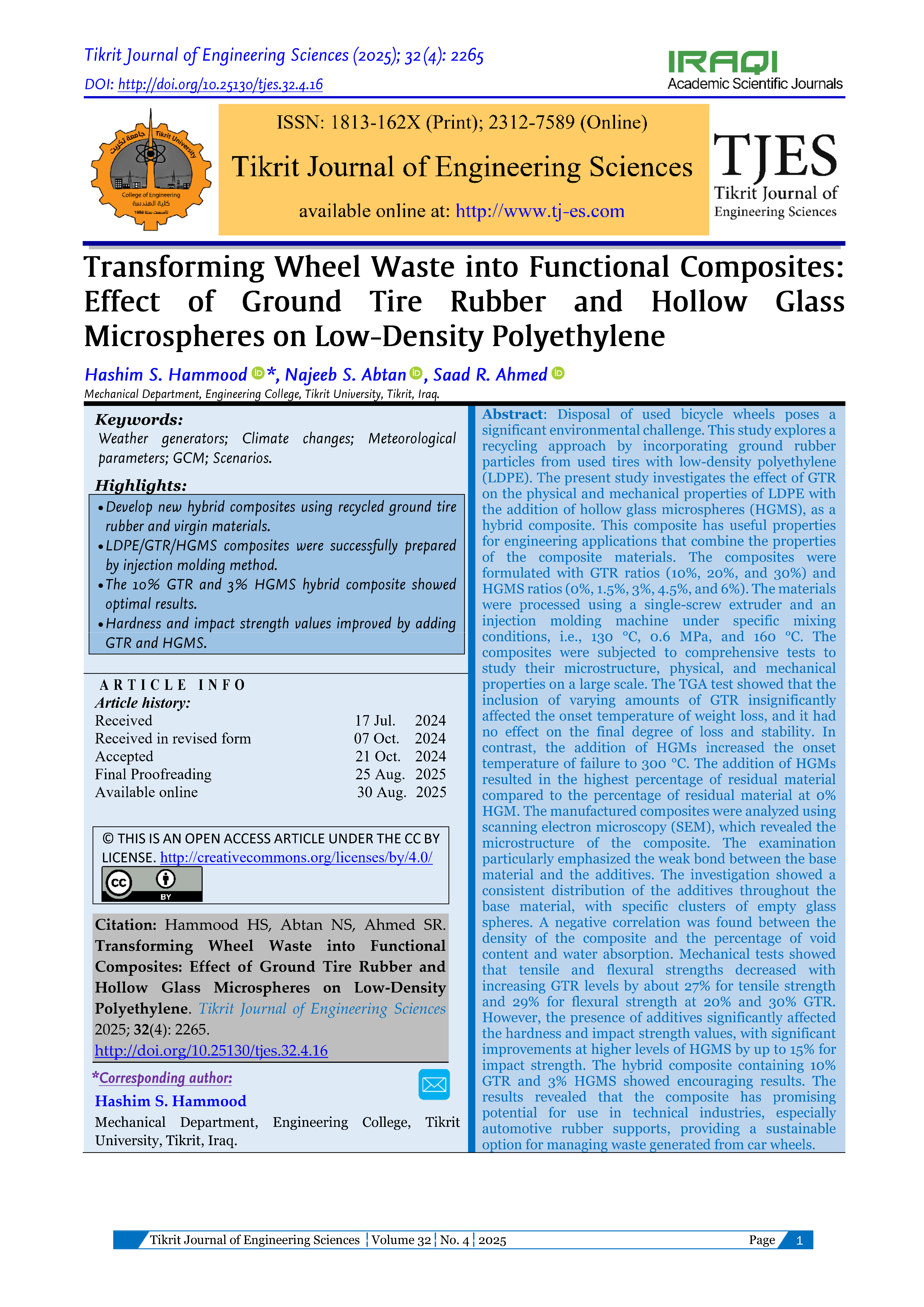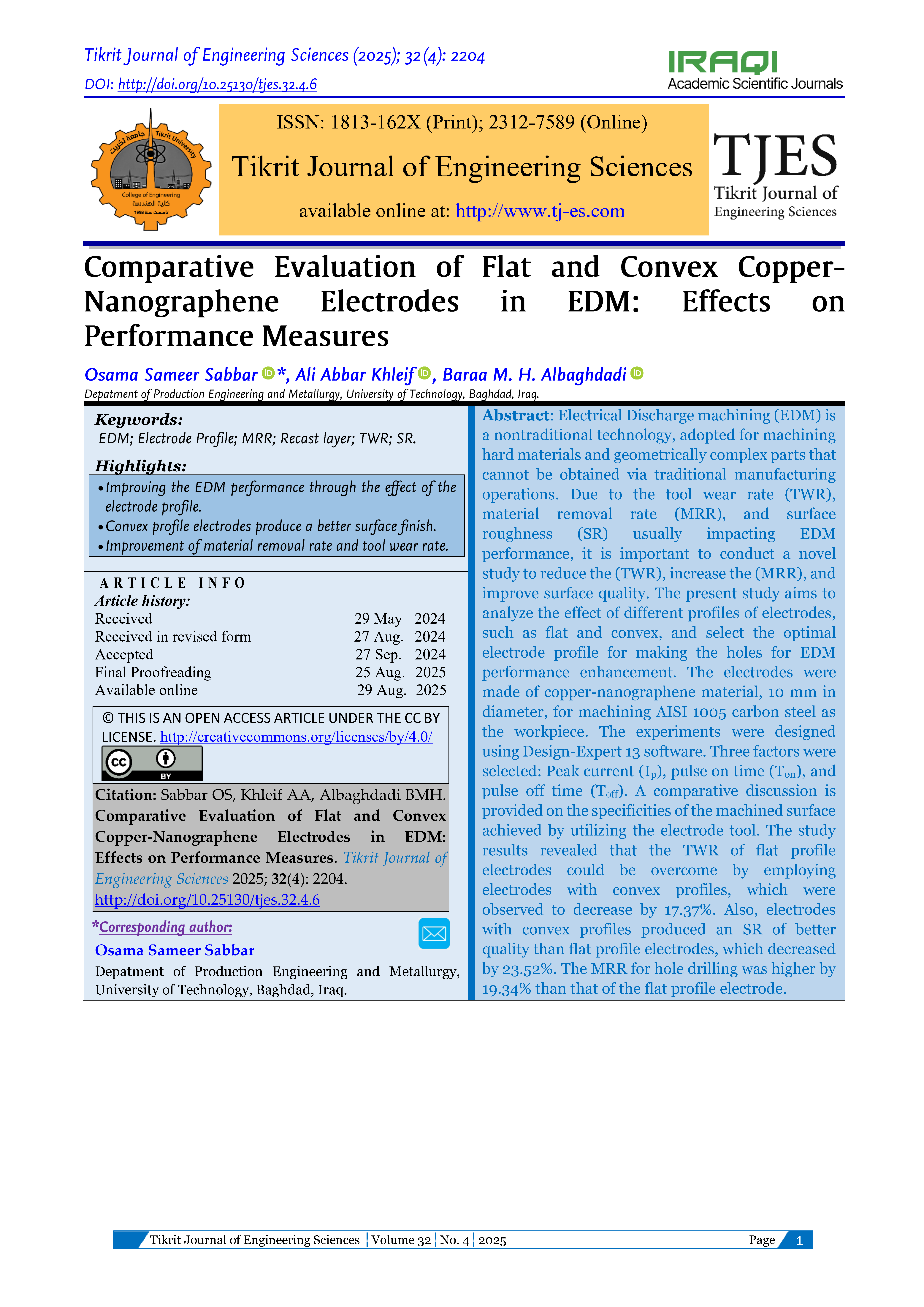 The Tikrit Journal of Engineering Sciences (Tikrit j. eng. sci.) (TJES) is a peer-reviewed journal published by the College of Engineering, Tikrit University. The journal’s aims are to disseminate the latest development and achievements in scientific research to the world’s community. To ensure quality, the submission of manuscripts to TJES shall be subjected to double-blind peer review by an international board of distinguished reviewers. The journal published 4-issues/a year and in English to strengthen the international exchange of academic research. The journal provides a forum for high-quality research communications and addresses all aspects of experimental observations based on theory and applications. The journal welcomes contributions from all who wish to report on new developments and the latest findings in engineering.