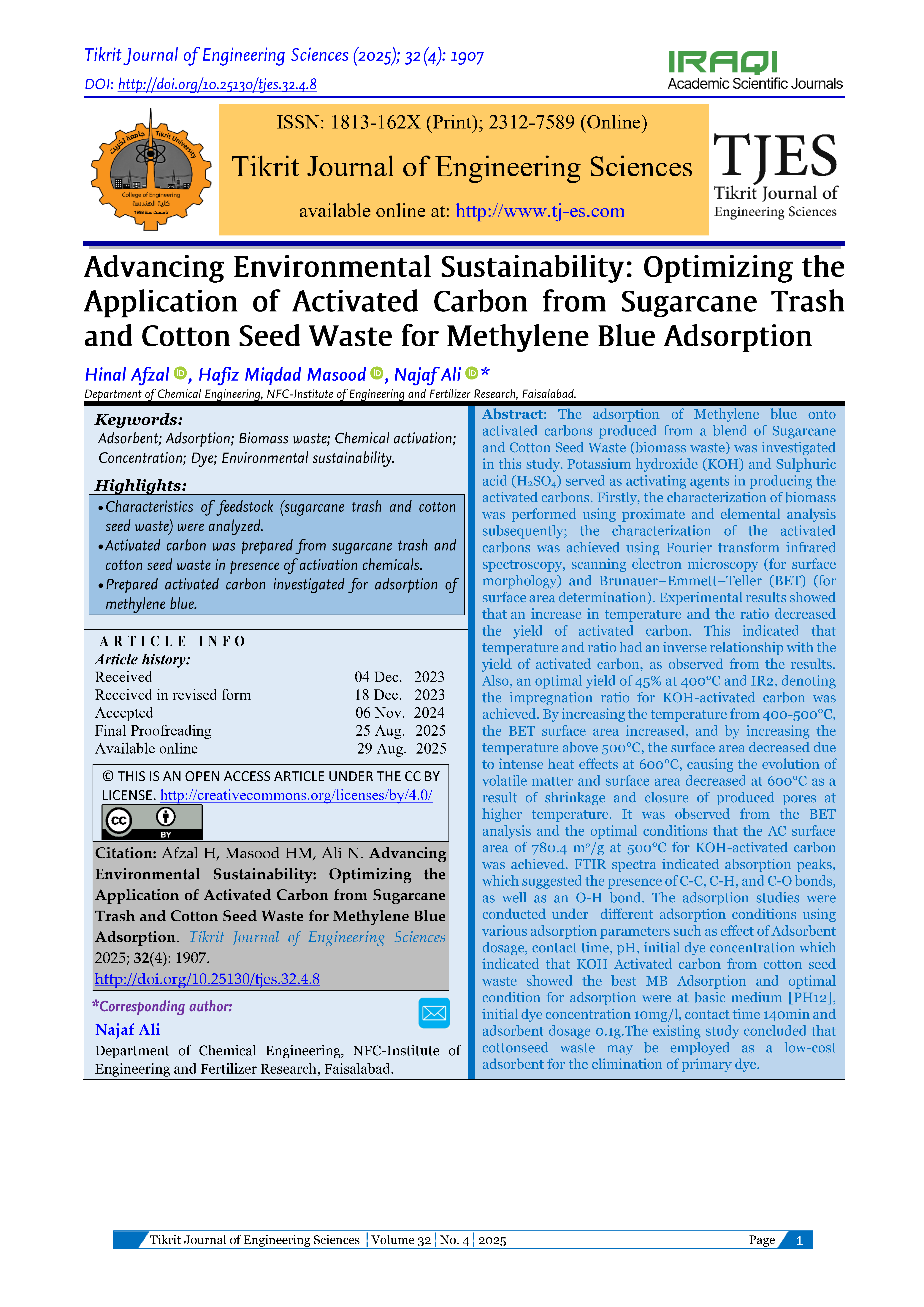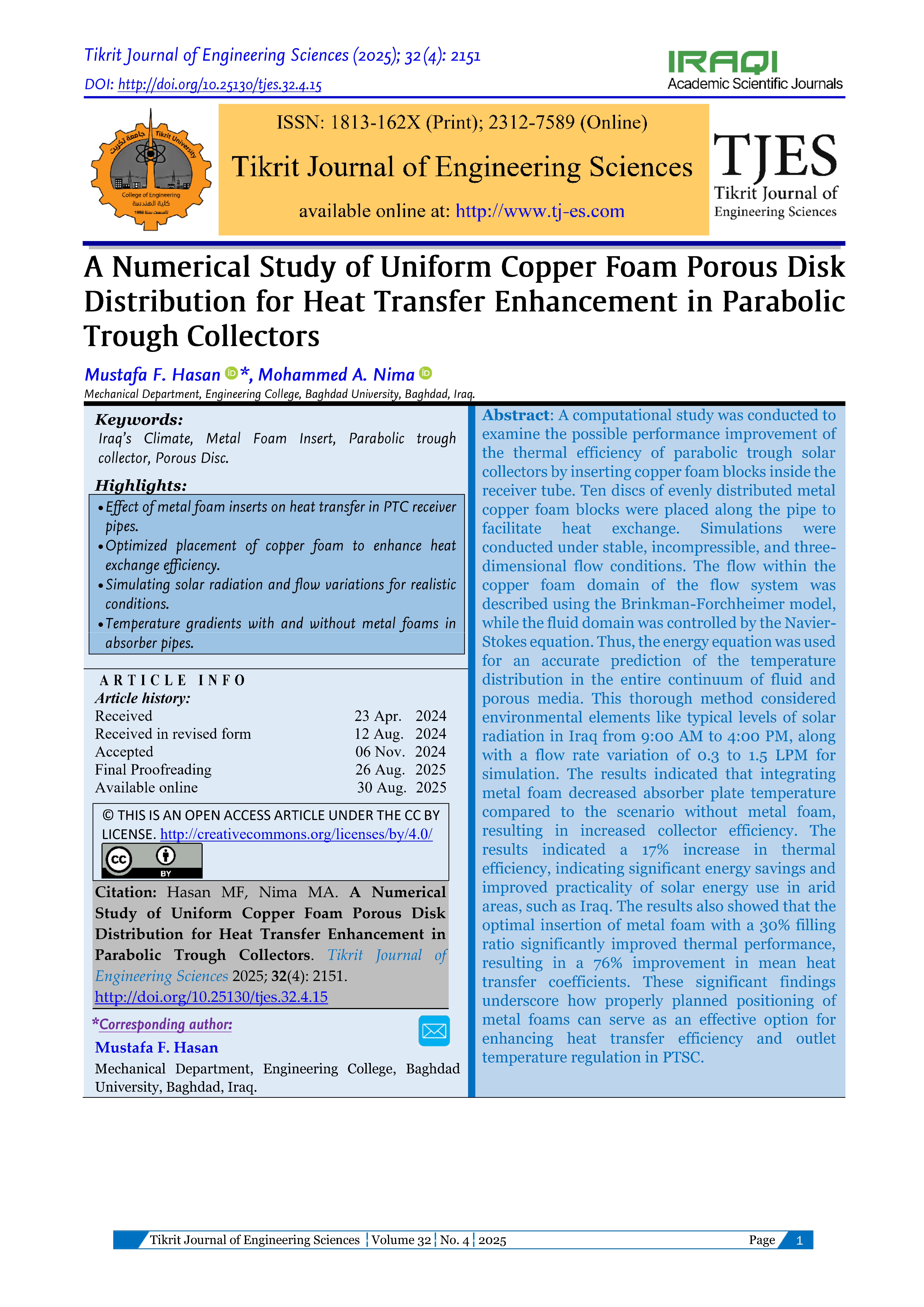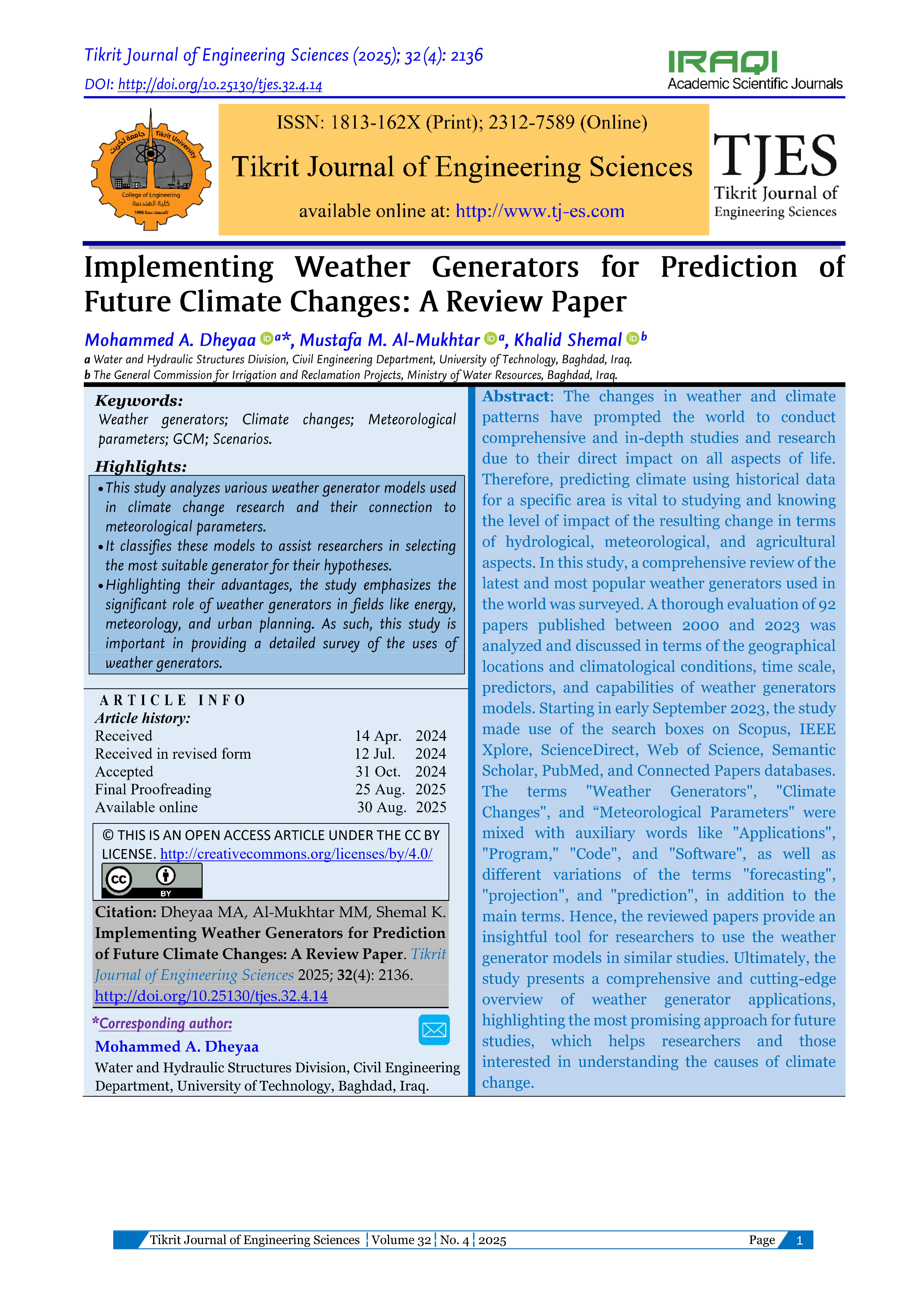 The Tikrit Journal of Engineering Sciences (Tikrit j. eng. sci.) (TJES) is a peer-reviewed journal published by the College of Engineering, Tikrit University. The journal’s aims are to disseminate the latest development and achievements in scientific research to the world’s community. To ensure quality, the submission of manuscripts to TJES shall be subjected to double-blind peer review by an international board of distinguished reviewers. The journal published 4-issues/a year and in English to strengthen the international exchange of academic research. The journal provides a forum for high-quality research communications and addresses all aspects of experimental observations based on theory and applications. The journal welcomes contributions from all who wish to report on new developments and the latest findings in engineering.