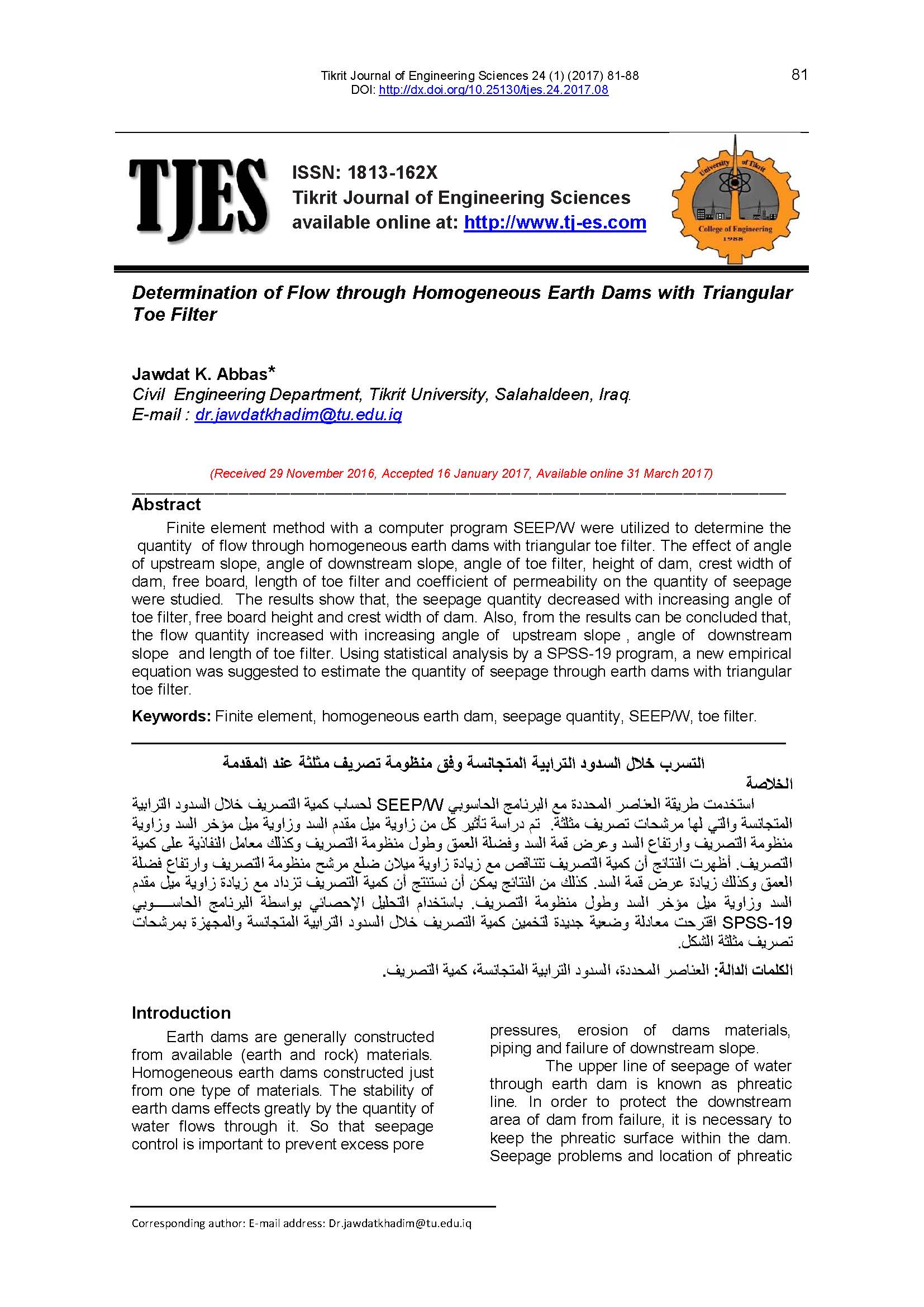 Finite element method with a computer program SEEP/W were utilized to determine the "quantity" of flow through homogeneous earth dams with triangular toe filter. The effect of angle of upstream slope, angle of downstream slope, angle of toe filter, height of dam, crest width of dam, free board, length of toe filter and coefficient of permeability on the quantity of seepage were studied. The results show that, the seepage quantity decreased with increasing angle of toe filter, free board height and crest width of dam. Also, from the results can be concluded that, the flow quantity increased with increasing angle of "upstream slope", angle of "downstream slope" and length of toe filter. Using statistical analysis by a SPSS-19 program, a new empirical equation was suggested to estimate the quantity of seepage through earth dams with triangular toe filter.