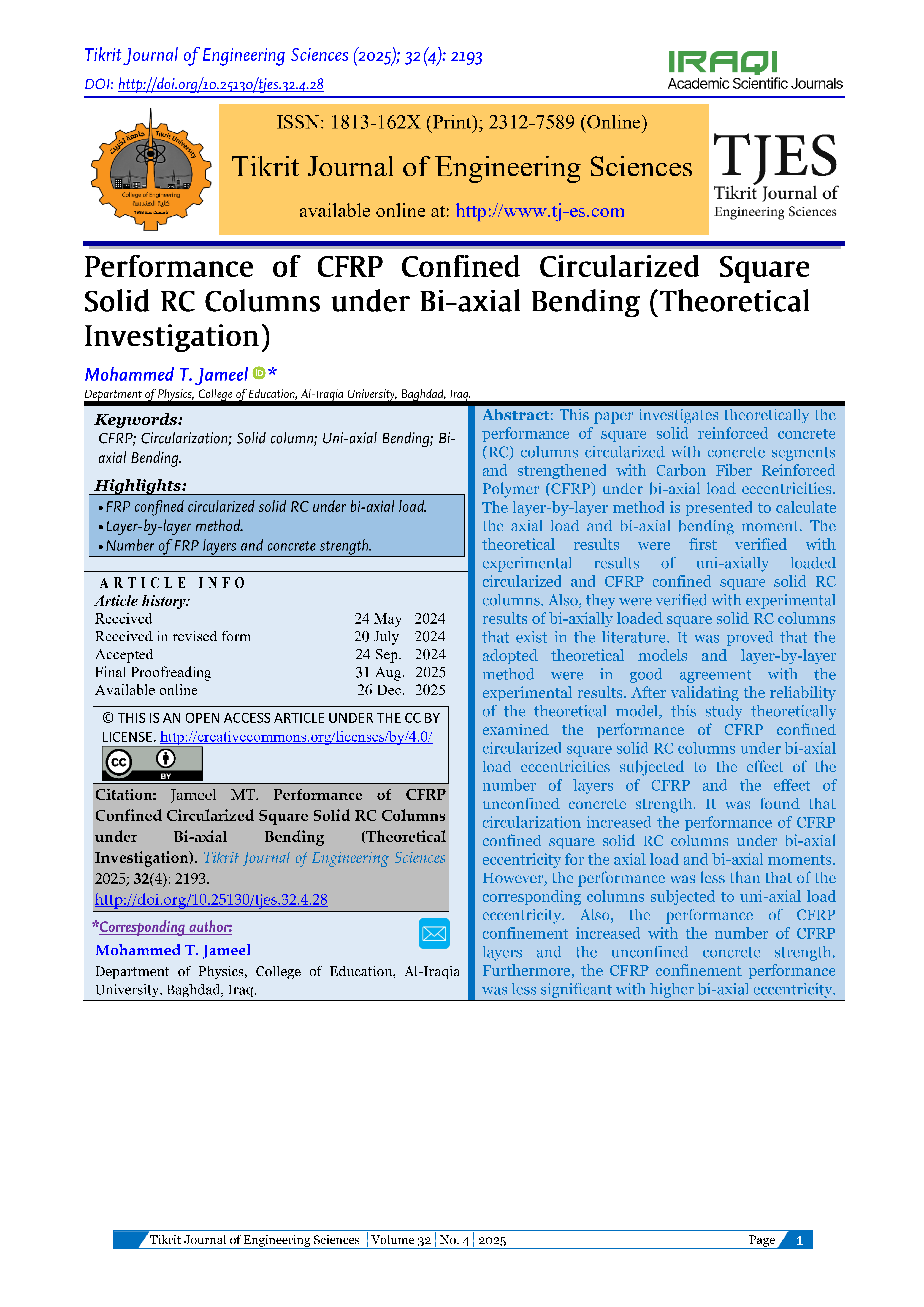 The Tikrit Journal of Engineering Sciences (Tikrit j. eng. sci.) (TJES) is a peer-reviewed journal published by the College of Engineering, Tikrit University. The journal’s aims are to disseminate the latest development and achievements in scientific research to the world’s community. To ensure quality, the submission of manuscripts to TJES shall be subjected to double-blind peer review by an international board of distinguished reviewers. The journal published 4-issues/a year and in English to strengthen the international exchange of academic research. The journal provides a forum for high-quality research communications and addresses all aspects of experimental observations based on theory and applications. The journal welcomes contributions from all who wish to report on new developments and the latest findings in engineering.